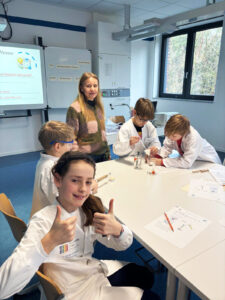 Mit großer Motivation und viel Neugier absolvierten sie erfolgreich den zweiten Workshop zum Thema „Hypothesen bilden“. Dabei konnten die Kinder die Inhalte aus dem ersten Workshop „Fragen stellen“ aktiv anwenden: Aus eigenen Forschungsfragen entwickelten sie passende Vermutungen und überprüften diese in verschiedenen naturwissenschaftlichen und technischen Experimenten.